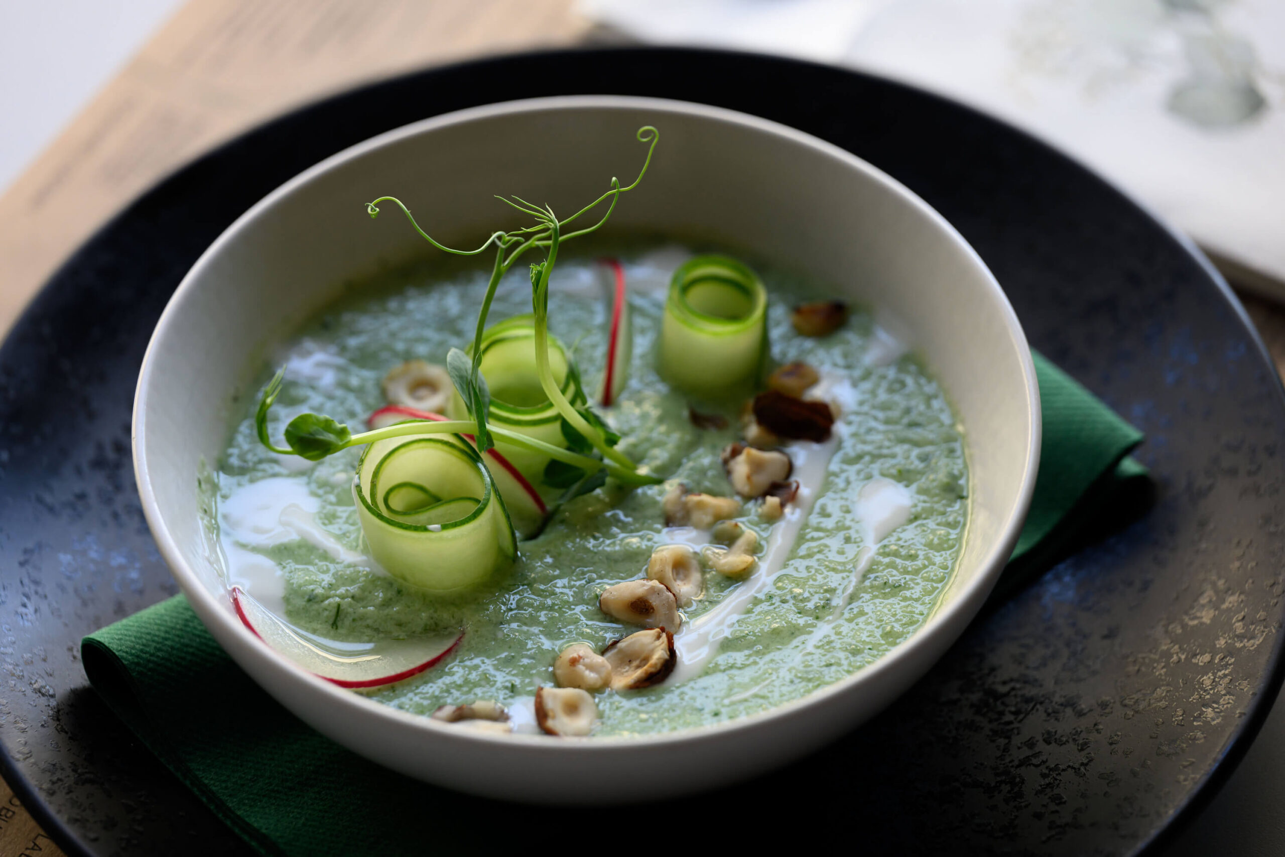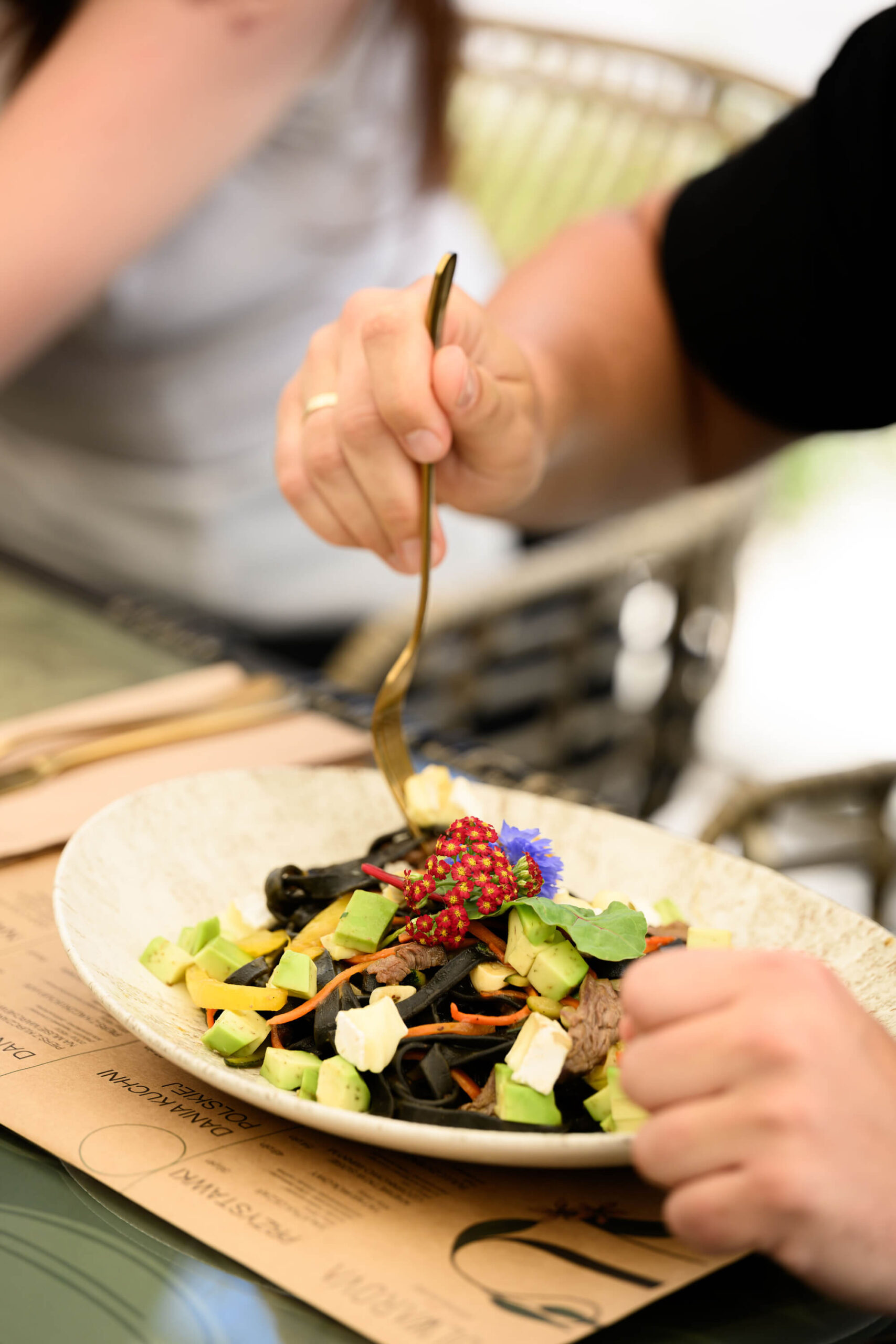 Kaszotto buraczane, botwinka, ser bundz, orzechy laskowe, sałatka z rukoli