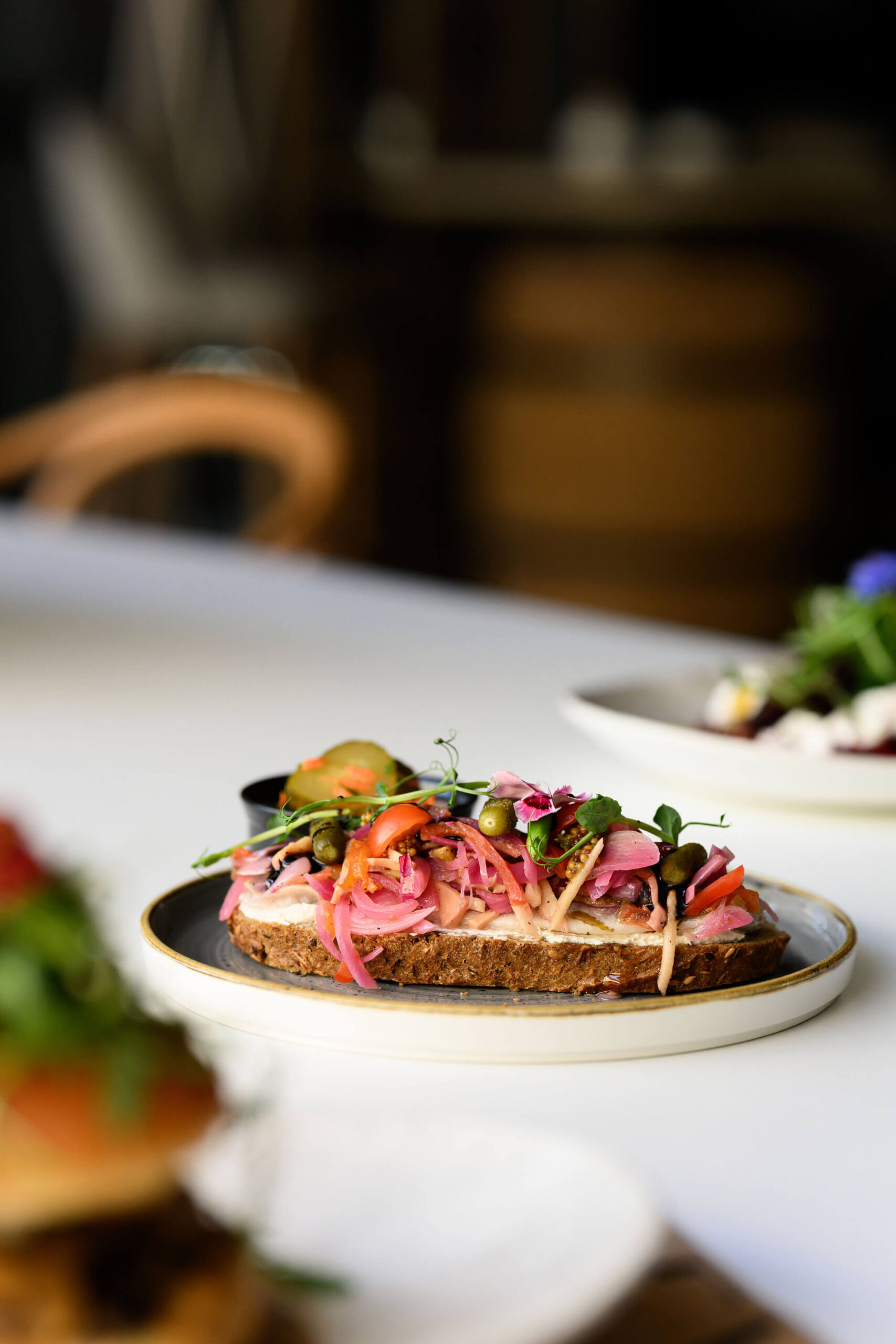 Matias, mus chrzanowy, marynowana cebula, pikle, chleb żytni