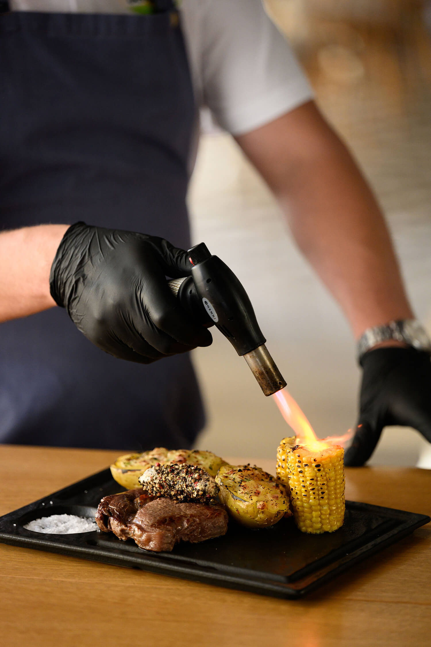 ziemniaki nadziewane gzikiem / pieczona kukurydza / masło pieprzowo-czosnkowe
